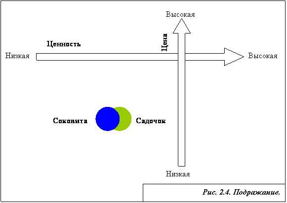 Стратегия подражания обычно характерна для фланговых брендов, представляющих собой конкурентный ответ через расширение портфеля брендов. Так, после выведения компанией «Сандора» флангового бренда в низкий ценовой уровень («Садочок»), Vitmark предпринял конкурентный ответ с маркой «Соковита», позиционированной в подражание «Садочку».[12]