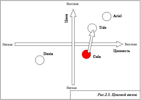 Одной из причин покупки Procter & Gamble компании «Ольвия Бета», явился успех ТМ Gala (до 30% рынка против 21% у Ariel, Tide, Bonux вместе взятых). В свою очередь, успех Gala объяснялся удачным позиционированием по отношению к Tide и Ariel – по сравнительно низкой цене при визуально эквивалентном качестве.