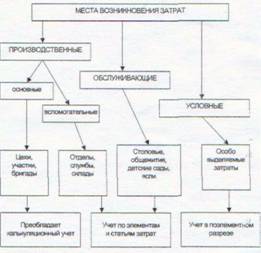 Здесь важное значение имеют выделяемые места возникновения затрат. Места возникновения затрат – это структурные единицы и подразделения (рабочие места, бригады, производства, участки, цеха, отделы и т. п.), в которых происходит первоначальное потребление производственных ресурсов и по которым организуется планирование, нормирование и учёт издержек производства в целях контроля и управления затратами, организации внутреннего, хозяйственного расчёта.