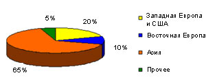 • Западная Европа и США - 20% • Восточная Европа - 10% • Азия - 65% • Прочее - 5%