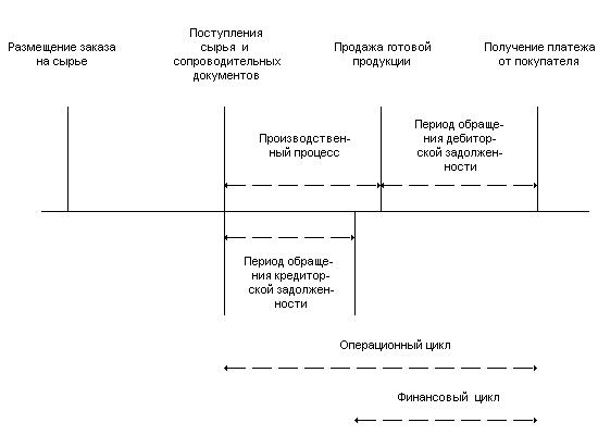 Логика представленной схемы заключается в следующем. Операционный цикл характеризует общее время, в течение которого финансовые ресурсы омертвлены в запасах и дебиторской задолженности. Поскольку предприятие оплачивает счета поставщиков с временным лагом, время, в течение которого денежные средства отвлечены из оборота, т. е. финансовый цикл, меньше на среднее время обращения кредиторской задолженности. Сокращение операционного и финансового циклов в динамике рассматривается как положительная тенденция. Если сокращение операционного цикла может быть сделано за счет ускорения производственного процесса и оборачиваемости дебиторской задолженности, то финансовый цикл может быть сокращен как за счет данных факторов, так и за счет некоторого некритического замедления оборачиваемости кредиторской задолженности.