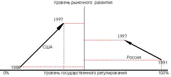 Видно, что Россия начала свое движение с точки более высокого развития (т.к. смогла использовать большое количество международных наработок) и много большего уровня регулирования, чем США. А если мы учтем, что в США процесс развития шел во много раз дольше, то прогресс России следует признать исключительно быстрым.
