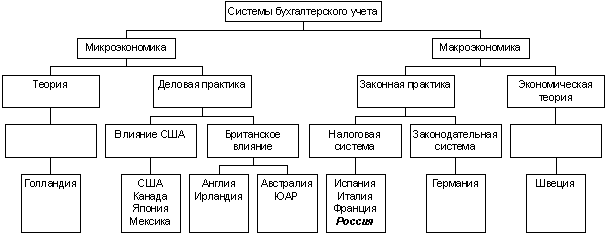 Другая интересная модель, в которой типизация осуществляется не только путем выделения характерных типов и черт, но и их иерархическим подчинением друг другу, приведена на Схеме 2.Верхний уровень иерархии определяет то, на какие экономические цели ориентируется учетная система страны - макро- или микроэкономические. Потом осуществляется градация в зависимости от того, на что ориентируется страна в построении системы учета - на теоретические разработки, или на практические потребности либо делового мира, либо законодательства. Наконец, в системах,. ориентированных на практику, можно осуществить деление по тому, как осуществляется регулирование - при помощи законодательства (британская система и Германия), или основную роль играют подзаконные акты. В макроэкономической ветви это прежде всего особенности налогообложения, а в американской - постановления частных организаций.