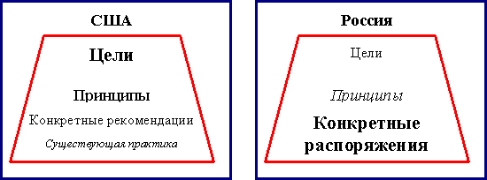 Хотя это может показаться странным, но базовые принципы учета декларированные в новой российской системе и в американской практически совпадают, хотя, конечно, не дословно и значимость их разная. Но существует важная проблема иерархического соподчинения целей, принципов и конкретных методик, которую необходимо учитывать.