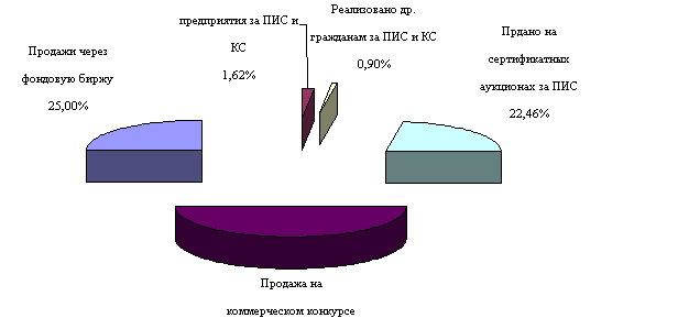 Уставный фонд предприятия разделён на 207 535 684 простых именных акций номиналом 0,25грн. и составляет 51 883921 грн. Привилегированных акций предприятие не выпускало. На сегодняшний день на льготных условиях работникам предприятия за денежные средства и КС реализовано 0,08% акций, за ПИС- 1,54% акций предприятия, высшему и среднему руководства реализовано- 0,90% акций. На фондовой бирже продано 25% акций. На сертификатном аукционе за ПИС реализовано 22,46% акций. Фонд госимущества выставляет на коммерческий конкурс 50,02%-ный пакет акций предприятия. Фактическое распределение акций ОАО «Дружковский машиностроительный завод» иллюстрирует рисунок 4.