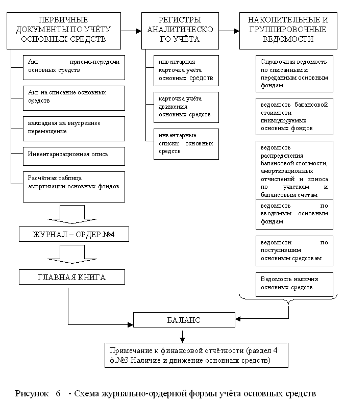 На ОАО «Дружковский машиностроительный завод» применяется журнально-ордерная форма бухгалтерского учета. В основе журнально-ордерной формы бухгалтерского учёта лежит принцип накапливания данных первичных документов путём использования накопительных ведомостей. Схематично движение документов при журнально-ордерной форме учёта основных средств приведена на рисунке 6.