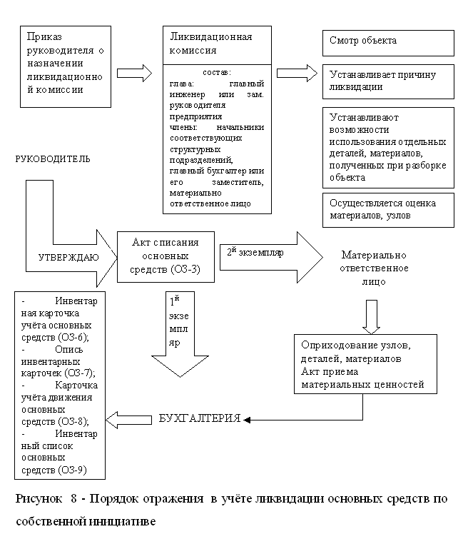Выбытие основных средств оформляется Актом на списание основных средств по форме ОЗ-3 (приложение ), в котором показывается первоначальная стоимость выбывшего объекта, сумма износа, остаточная стоимость, причина выбытия объекта, расходы, связанные с выбытием объекта, сумма полученного дохода. Акт составляется в двух экземплярах комиссией, которая утверждена приказом руководителя. На основании акта делают в материальной бухгалтерии соответствующие записи в инвентарных карточках и инвентарных списках. На основании данных актов по результат каждого месяца составляется ведомость балансовой стоимости объектов, ликвидируемых по заводу (приложение ), которая ведется в разрезе групп основных фондов с указанием балансовой стоимости ликвидируемых объектов.