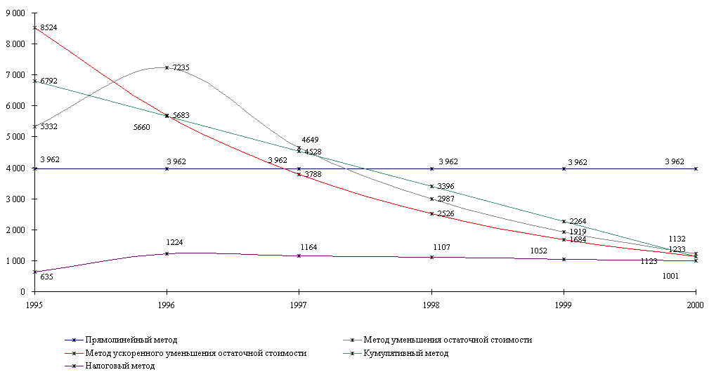 На основании сделанных расчётов начисления амортизации рельсового пути разными методами построим график сравнения данных методов в разрезе начисленных сумм амортизационных отчислений по годам (рисунок 10).