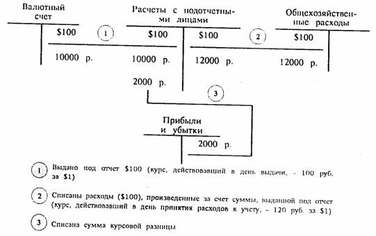 Продолжим пример, приведенный на рис. 1. За отчетный период организацией выданы под отчет на командировочные расходы различные денежные средства в сумме 100 дол. США, что в пересчете в рубли по текущему курсу составляет 100 тыс. Руб. В учете эта операция найдет отражение на счете Расчетов с подотчетными лицами в российской валюте в сумме 100 ты. Руб.; параллельно за работниками, направленными в служебные командировки за границу, будет числиться задолженность в иностранной валюте на сумму 100 дол. США.