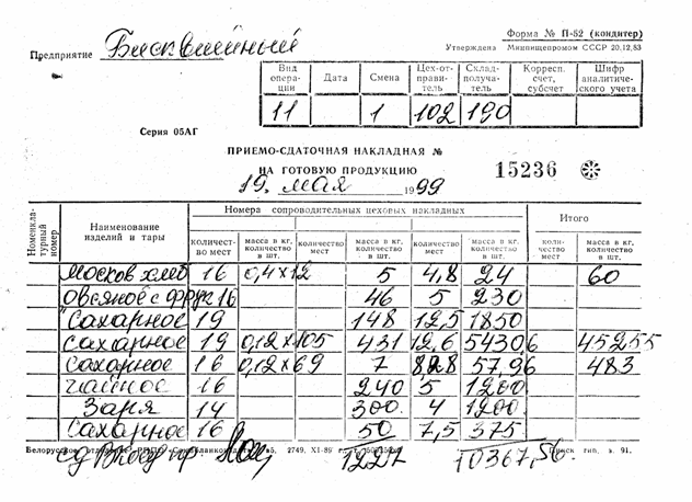Сдача готовых изделий из производства на склад оформляется приемо-сдаточными накладными (рис. 1). В них указываются: цех, сдающий продукцию; склад, принимающий ее; номенклатурный номер (код) и наименование продукции; единица измерения, количество и др. Конкретное содержание приемосдаточных накладных зависит от особенностей технологии и характера выпускаемой продукции. Они подписываются представителем технического контроля, работником сдающего цеха, заведующим складом (кладовщиком) или другим материально ответственным лицом, принявшим на хранение продукцию. Когда договором предусмотрена приемка продукции с участием представителя заказчика (покупателя), то на документах должна быть и его подпись. Приемо-сдаточные накладные могут быть разовыми и накопительными (декадные, месячные). Они выписываются цехом-сдатчиком в двух экземплярах. Один экземпляр передается заведующему складом (кладовщику), а другой с распиской в приеме продукции остается в цехе.