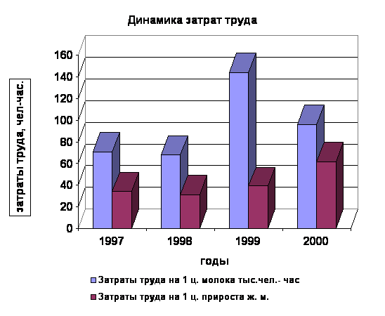 Из таблицы видно, что общие затраты труда в 2000 г. возросли на 53 тыс. чел – часов и составили 150,48% от уровня 1997 г. Причем по молоку затраты труда увеличились на 25 тыс. чел.- часов (135,21%), а по приросту живой массы скота – увеличились на 28 тыс. чел.-часов (182,35%). Сравнение данных по затратам труда на 1 ц продукции КРС показывает снижение трудоемкости 1 ц молока на 8,82 чел.-часа, что составило 30,42% от базисного уровня, и снижение трудоемкости 1 ц прироста живой массы на 0,34 чел-часа 60,63%).