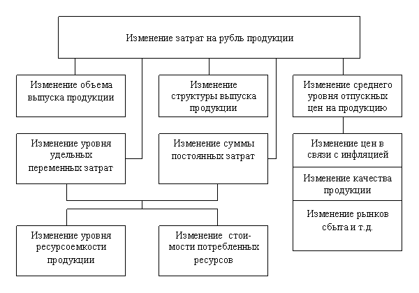 Затраты на рубль продукции непосредственно зависят от изменения общей суммы затрат на производство и реализацию продукции и от изменения стоимости произведенной продукции. На общую сумму затрат оказывают влияние объем производства продукции, ее структура, изменение переменных и постоянных затрат, которые в свою очередь могут увеличиться или уменьшиться за счет уровня ресурсоемкости продукции и цен на потребленные ресурсы. Стоимость произведенной продукции зависит от объема выпуска, его структуры и цен на продукцию.