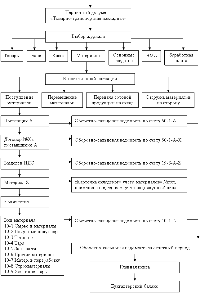 На рис.1 схематично показан алгоритм принятия к бухгалтерскому учету первичного документа на примере покупки материалов для производства.