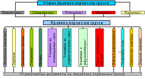Для разработки комплексной системы нормирования технологии перевозки все грузы разбиты на пять видов: навалочные, генеральные, режимные, опасные и наливные. Комплексная система нормирования технологии перевозки грузов может быть представлена в таком виде: