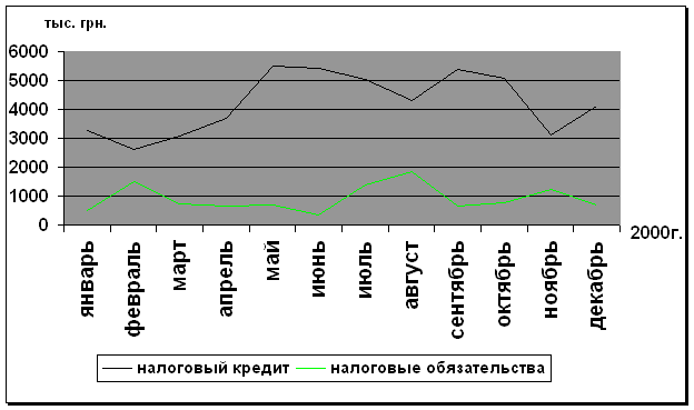 Рис. 4.3 Динамика превышения налогового кредита над обязательствами по данным ГАО “ПДМН” за 2000г.