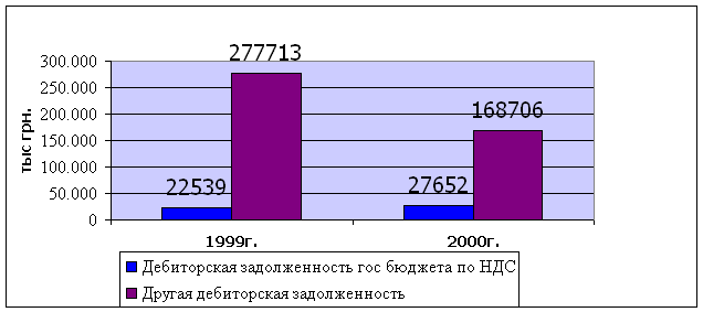 На рисунках 4.4и 4.5 видно, что сумма дебиторской задолженности по НДС занимает значительную часть всей дебиторской задолженности ГАО “ПДМН” и 95% во всей дебиторской задолженности бюджета перед предприятием , которая составляет, 22 539 тыс. грн. в 1999 г. и 27 652 тыс. грн. в 2000г., что является отвлечением оборотных средств предприятия, и приводит, в свою очередь, к потери прибыли.