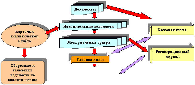 Мемориально-ордерная форма даёт широкие возможности для деления бухгалтерской работы, но требует многоразового переписывания данных из регистра в регистр (см. рис. 2.9).
