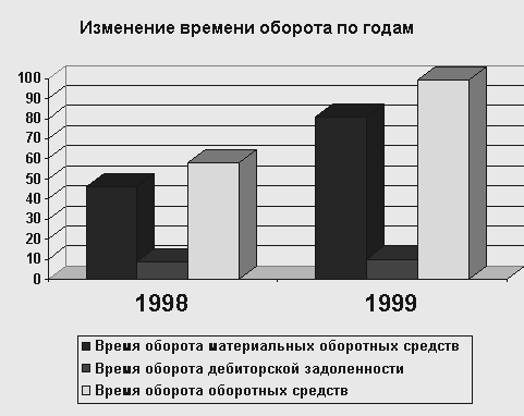 Более существенно уменьшилась оборачиваемость материальных оборотных средств с 7,9 оборотов в 1998 году до 4,5 оборотов в 1999 году. Соответственно время оборота увеличилось до 86,5 дней. Уменьшение оборачиваемости в 1999 году произошло за счёт затруднений со сбытом продукции, которые в свою очередь вызваны неэффективностью управления запасами; недостаточным исследованием фирмой рынков сбыта своей продукции и возможностей расширения каналов сбыта.