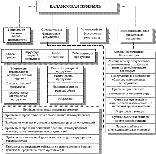 Прибыль состоит: 1) прибыль от реализации продукции, 2) прибыль от прочей реализации, 3) доходы (расходы) от внереализационных операций, где последний пункт состоит из: доходы (расходы) по ценным бумагам и от долевого участия в СП; штрафы, пени, неустойки; прибыли и убытия прошлых лет, выявленные в отчетном году; поступления долгов и ДЗ; получение финансовой помощи и др.